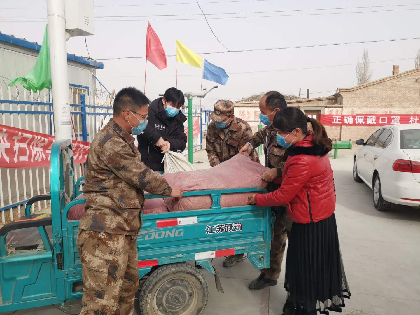 秦澤洪帶領連隊黨支部、“兩委”干部和家人,給職工群眾發放米面。杜家福 攝