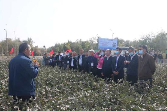 中新網新疆新聞10月7日電(王志清) 10月6日,中國工程院院士康紹忠、李培武及國內農業專家在塔里木大學無膜棉示范田進行觀摩。這塊62畝的無膜棉田畝收獲株數12633株,籽棉產量為345.3kg/畝,無膜棉長勢喜人,豐收在望,標志著新疆無膜棉配套栽培技術初步成熟。