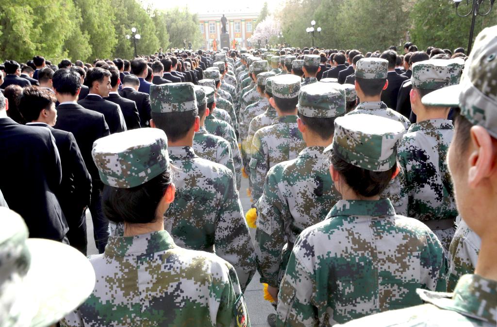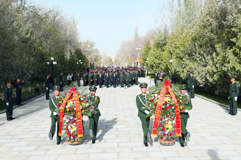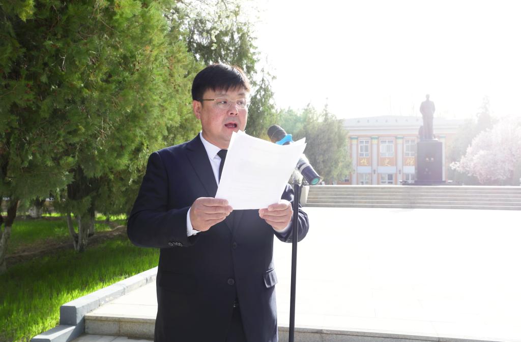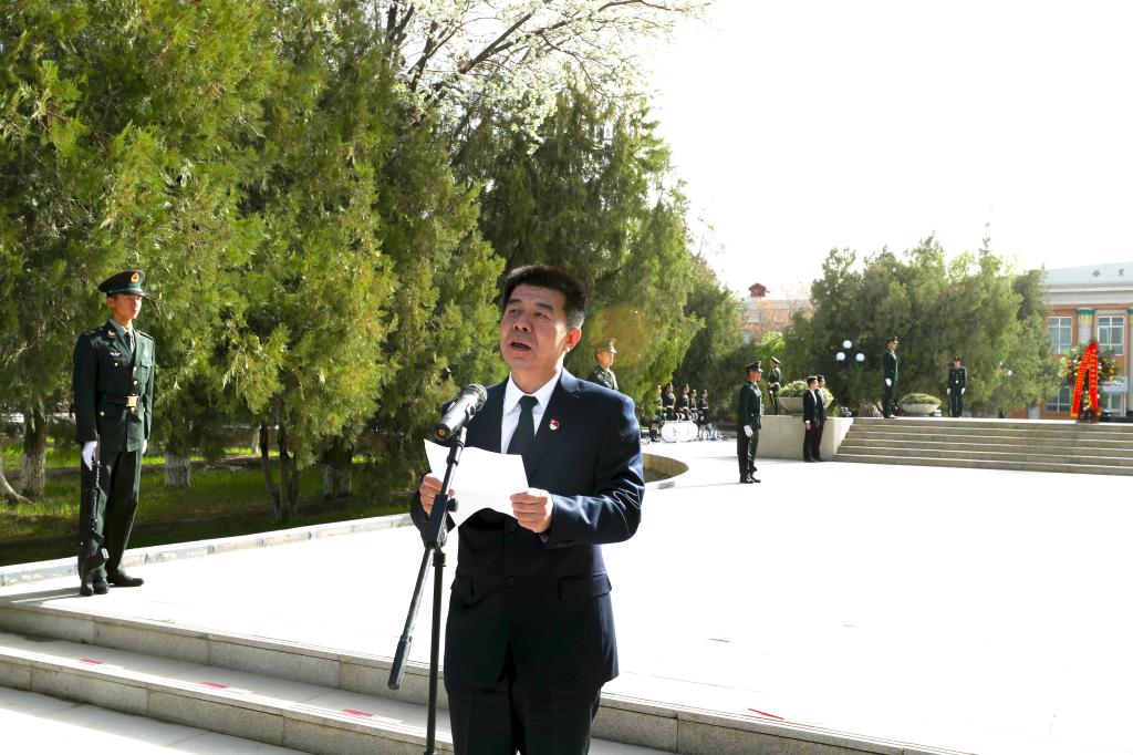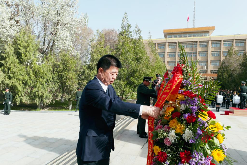張傳輝主持指出,值此清明節之際,一師人武部官兵代表、塔里木大學全體副處級以上干部和師生代表懷著無比崇敬的心情,在這里莊嚴集會,舉行向王震將軍銅像敬獻花籃儀式,就是為了緬懷王震將軍為代表的屯墾先輩們的豐功偉績,表達我們傳承紅色血脈、發揚南泥灣優良傳統和抗大作風的堅定信心;更表達我們貫徹落實習近平總書記重要指示精神,堅持用胡楊精神育人、為興疆固邊服務,努力寫好建設兵團特點、南疆特色高水平大學這一新時代奮進之筆的堅強決心。塔里木大學趙雙喜攝