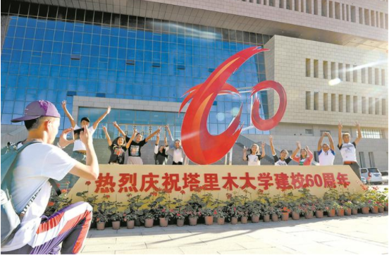 圖⑦塔里木大學在校大學生在慶祝建校60周年的校慶標識前合影留念(資料圖片)。 兵團日報記者 王志清 攝