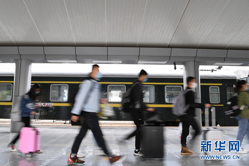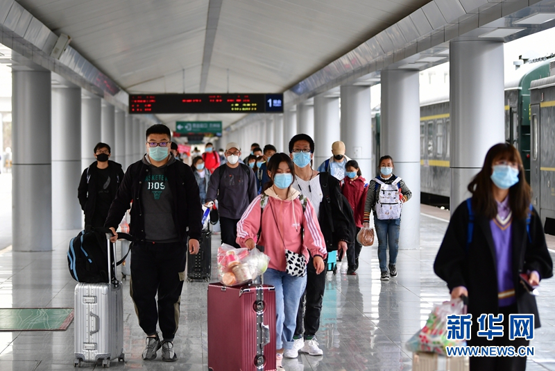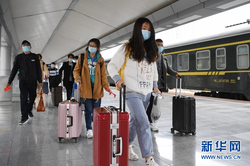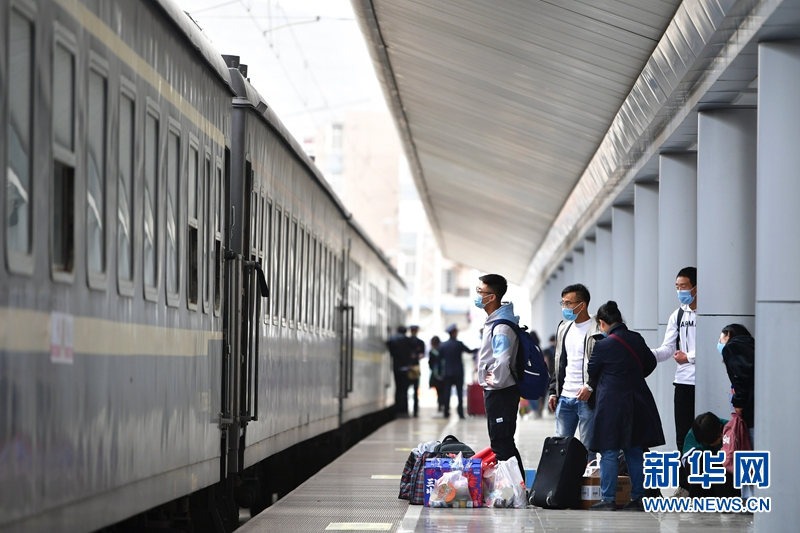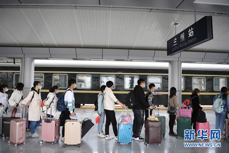 4月17日,塔里木大學的學生準備從蘭州火車站登上學生專列出發。新華社記者 陳斌 攝