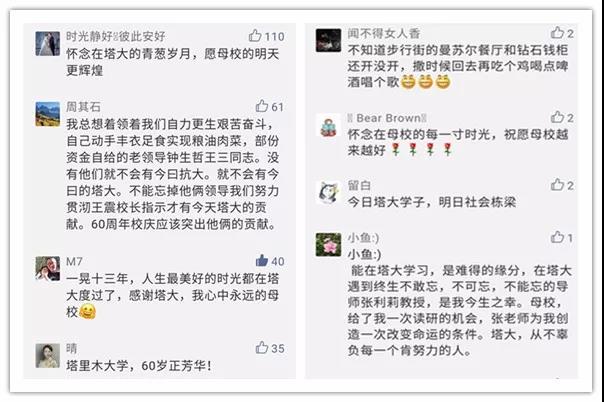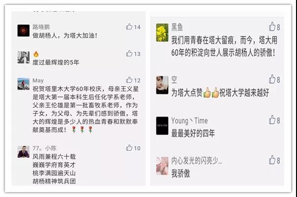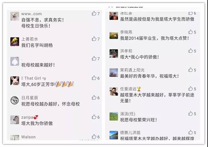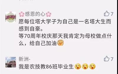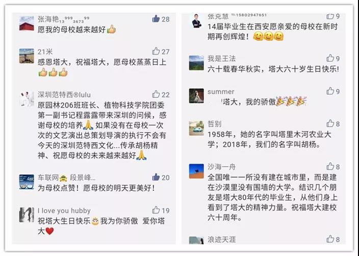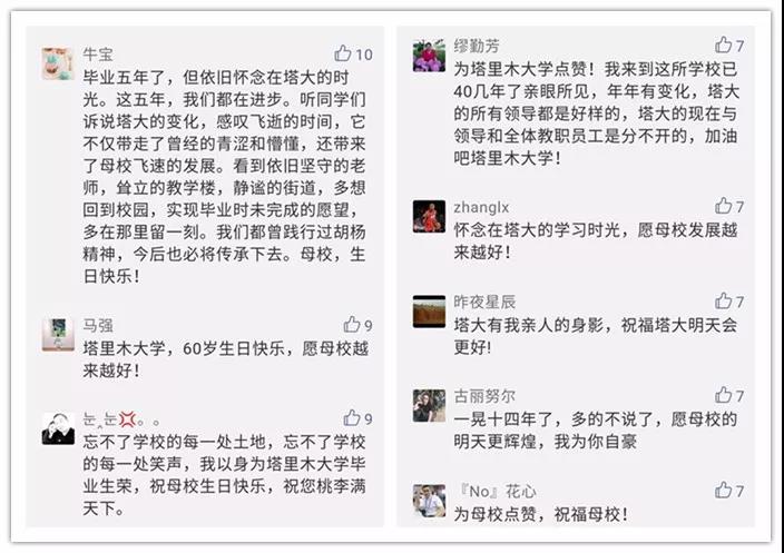 還有很多情真意切、衷心誠摯的祝福留言,因精選留言人數(shù)上限,小編無法將你們的留言精選入內(nèi)。但我知道,你愛塔里木大學是真的!