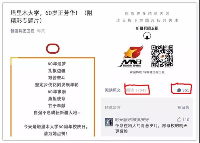 10月5日,塔里木大學舉行建校60周年慶祝大會。10月6日,新疆兵團衛(wèi)視微信公眾平臺發(fā)出塔里木大學,60歲正芳華!(附精彩專題片)。不到24小時,微信閱讀量超過“17000+”,點贊量過“350+”,分享人數(shù)超“400+”。