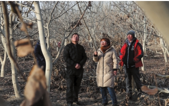 12月15日,塔里木大學植物科學學院教授張銳(中)在指導團場職工學習核桃剪枝技術。每年該校6個科技特派員示范基地的“百名專家、千名學生”走進田間地頭,推進科技成果轉化。