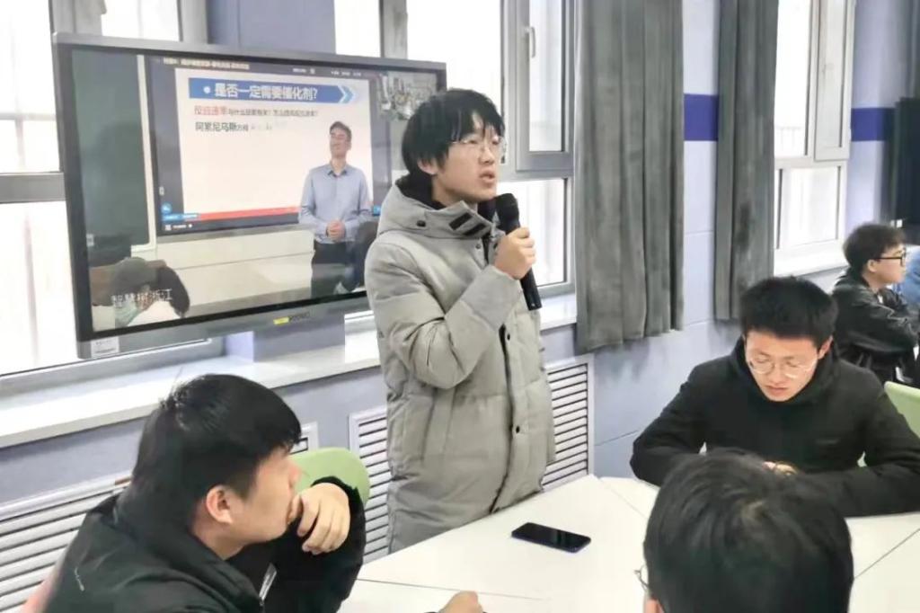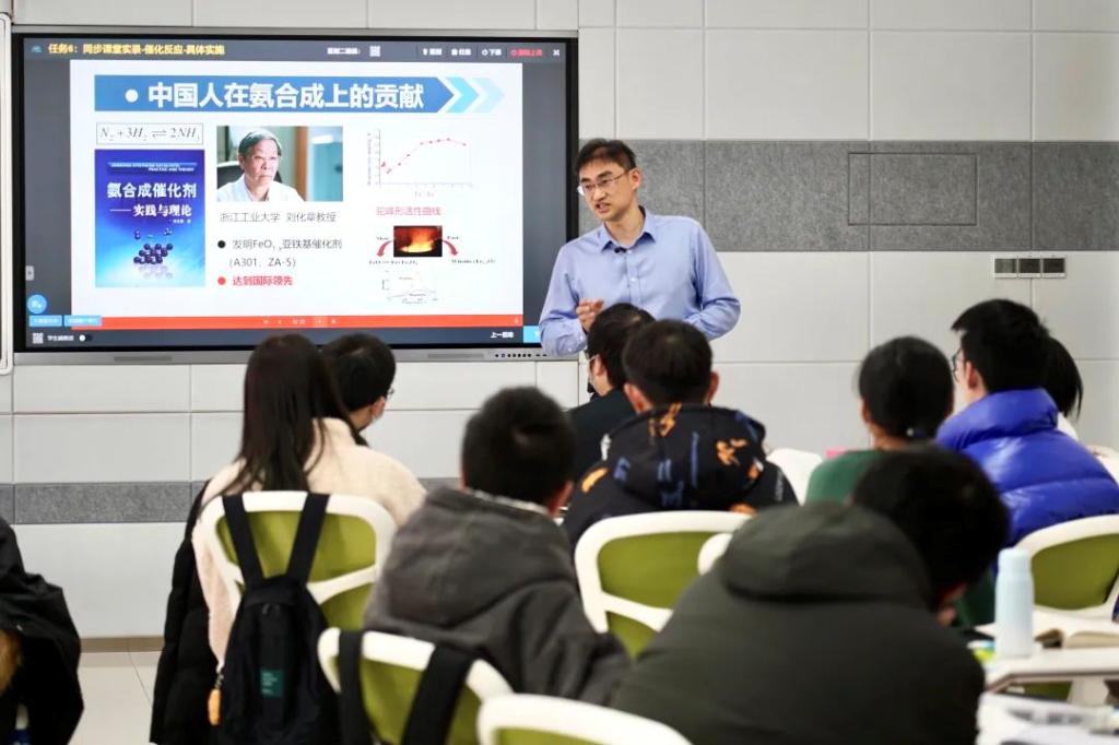 雖然首堂課僅歷時45分鐘,但在唐浩東精彩的講授下,兩地同學緊緊圍繞催化反應及動力學課程主題,就催化劑為什么能改變反應途徑、降低活化能,以及催化劑如何參與反應等展開了激烈討論,課堂氣氛活躍。同時,唐浩東將學院劉化章教授發明合成氨催化劑的故事貫穿其中,帶領同學們感悟科學家精神,實現思政教育與專業課程的深度融合。