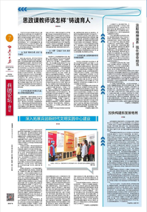 講好鑄牢中華民族共同體意識這堂思政課,必須要貼近實際、貼近生活、貼近學生。這就要求思政課教師緊密聯系中華民族多元一體的歷史實際和生動實踐,用學生喜聞樂見的語言、直觀形象的事跡來講好中國故事、新疆故事、兵團故事,宣傳闡釋好兵團精神和胡楊精神、老兵精神,努力增強思想政治理論課的針對性、實效性、吸引力和感染力。惟其如此,才能用馬克思主義中國化的最新理論成果凝聚人心、振奮精神,才能在“熱愛偉大祖國、建設美好家園”的歷史實踐中堅定正確方向,唱響主旋律,壯大正能量,使鑄牢中華民族共同體意識潤物細無聲地浸潤到學生們的心田,轉化為愛國愛疆、擔當奉獻的生動實踐。