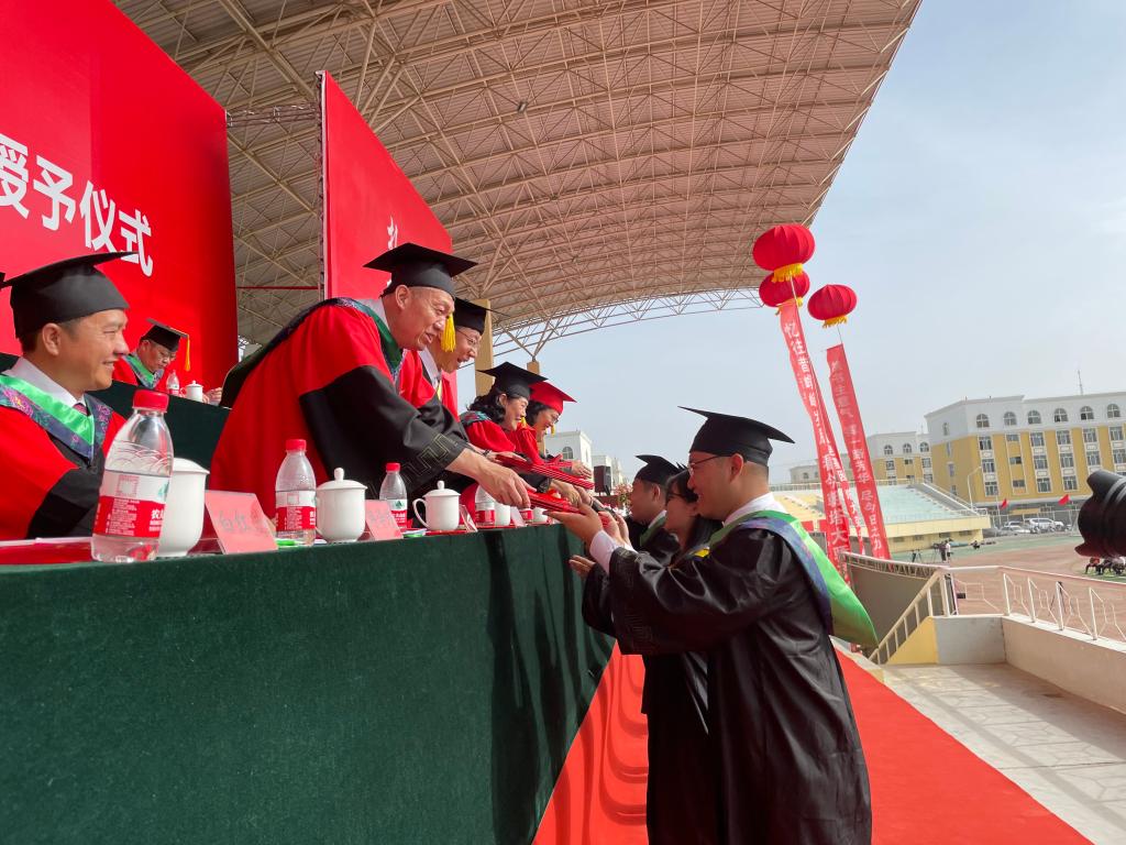 塔里木大學(xué)校領(lǐng)導(dǎo)為畢業(yè)生頒發(fā)2022年畢業(yè)證書(攝于6月14日)。兵團(tuán)日報(bào)全媒體記者 阿熱依·熱依哈巴提 攝