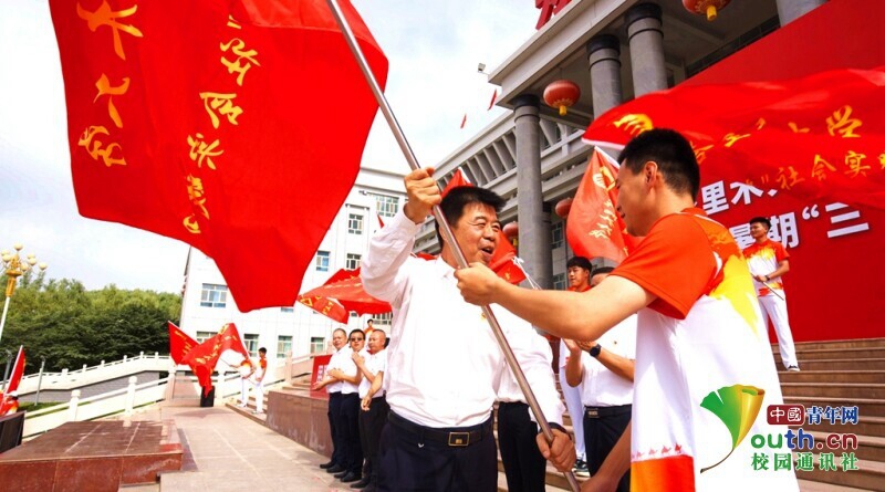 圖為塔里木大學黨委書記趙光輝為出征團隊授旗。中國青年網通訊員 楊寶仁 供圖