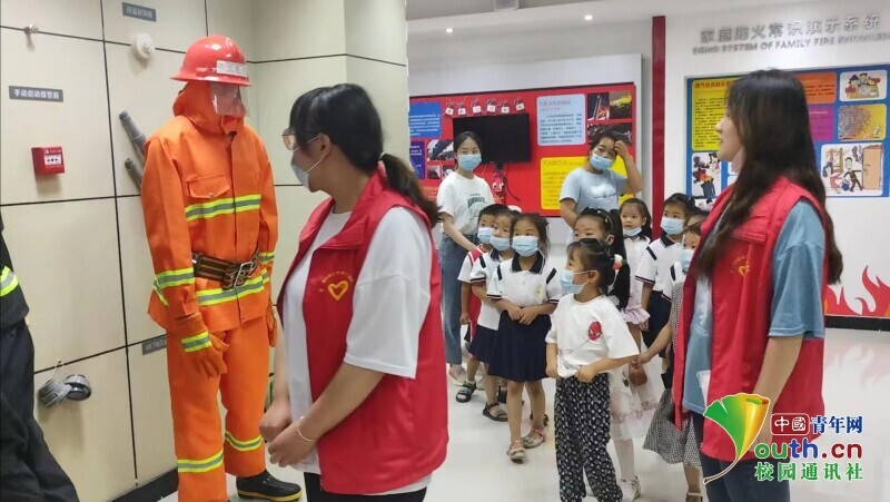 圖為志愿者帶領小朋友觀看消防員模型。中國青年網通訊員俞芳榮 攝。