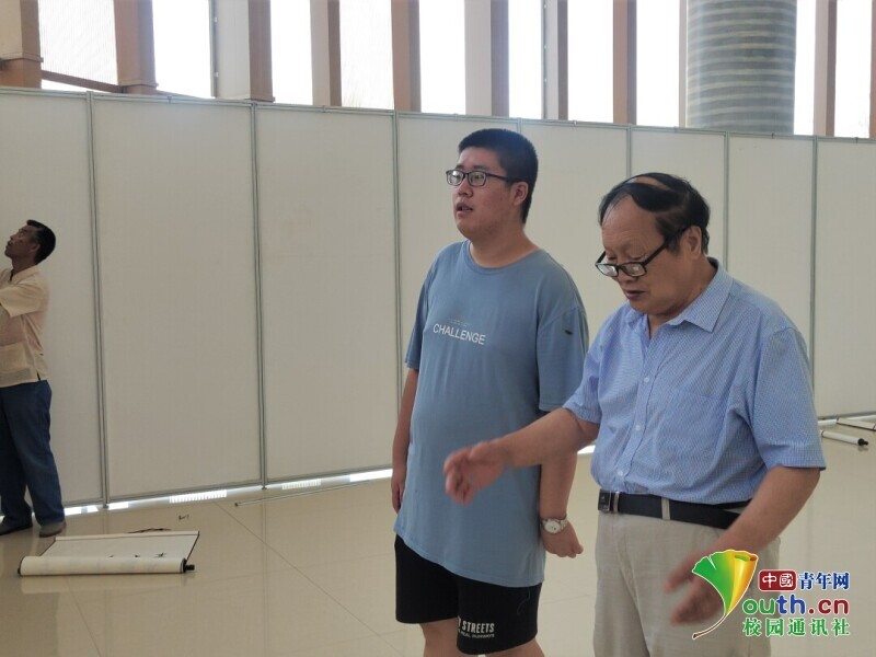 圖為志愿者與老年書畫協會會長探討展覽布局。中國青年網通訊員 郭樂樂 攝