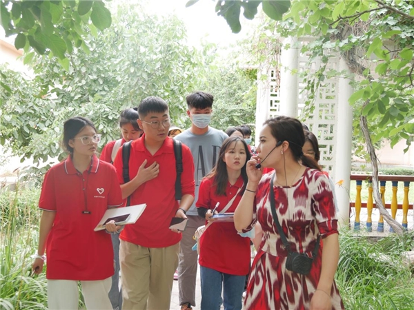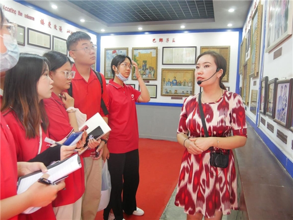 圖為庫車王府講解員為團隊成員講解王府概況。中國青年網通訊員 王鑫東 攝