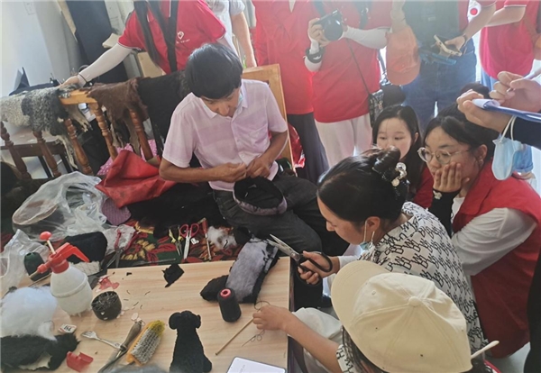 圖為團隊成員觀摩學習卡拉庫爾胎羔皮帽制作工藝。通訊員 高潔 攝