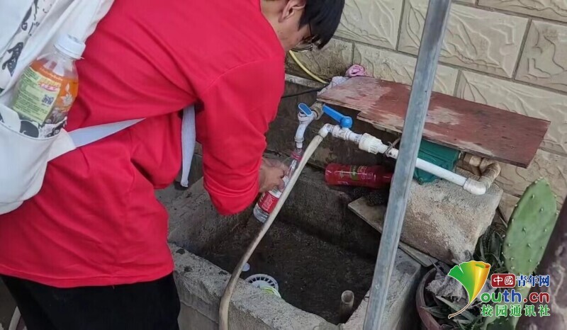 圖為實踐團隊成員在農村采集水樣的圖片。中國青年網通訊員 崔騰 攝