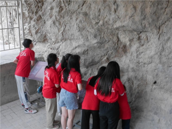 圖為實(shí)踐隊(duì)在調(diào)查劉平國刻石。中國青年網(wǎng)通訊員 李雙鳳 攝