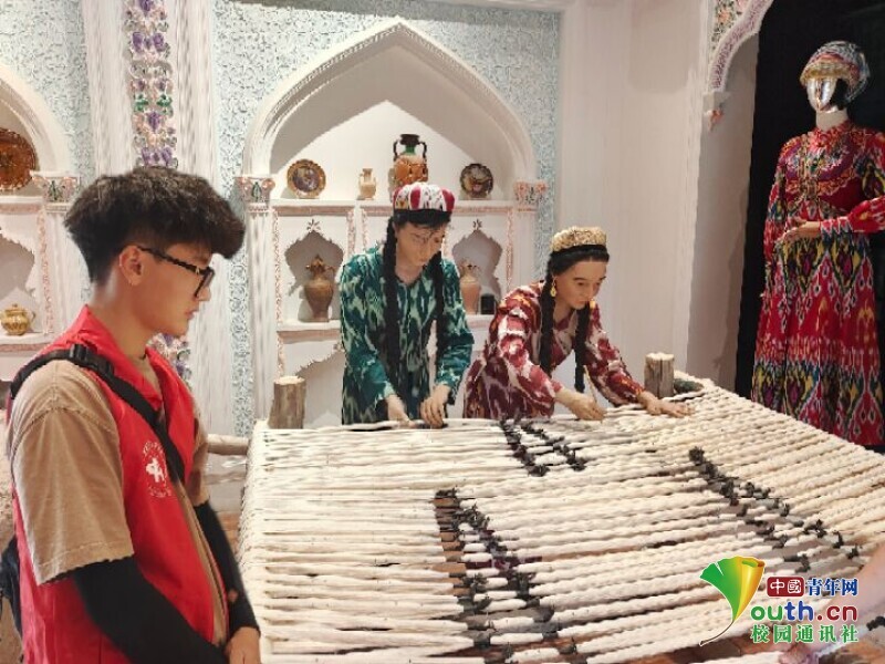????圖為實踐團隊參觀艾特萊斯綢制作工藝,了解制作艾特萊斯綢每一個步驟。中國青年網通訊員 張耀輝 攝???