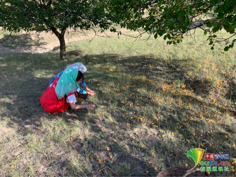 圖為團隊成員幫助村民拾撿杏子。中國青年網通訊員 李明霞 供圖