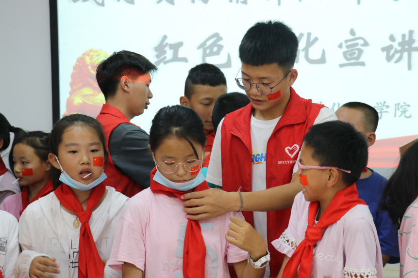 宣講過程中,團隊宣講組成員向社區青少年講述了曾參加抗美援朝戰役并參加慶祝中國共產黨成立100周年大會的買生山老人、原農一師副師長及上海老知青楊海涵老人、曾參與修建中巴公路并為中巴兩國友誼宣傳十余載的田念勝老人、十六歲就進疆并參與中巴公路修筑的霍保鎮老人、為新疆發展獻了青春獻兒孫的劉新民老人、曾駐守昆侖山神仙灣哨所的王俊春老人等人的事跡。并通過為少先隊員佩戴紅領巾、組織社區青少年朗誦紅色詩歌、開展紅色知識競答等多種形式豐富活動內容。