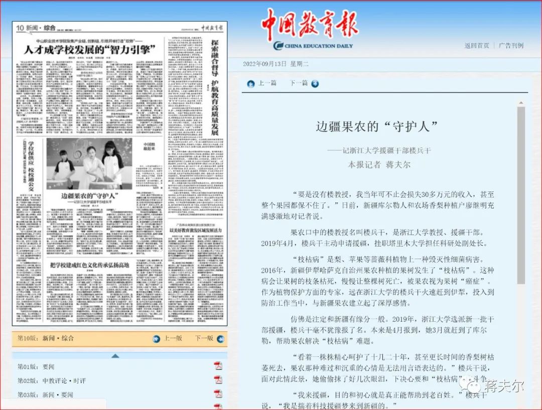 常年堅(jiān)持在新疆基層一線、田間地頭搞研究,為防治病害發(fā)揮了關(guān)鍵性作用……2019年12月,浙江大學(xué)黨委收到一封感謝信,信是新疆林業(yè)和草原局寫(xiě)的,一字一句中表達(dá)著對(duì)樓兵干辛勤付出的感謝。通過(guò)推廣實(shí)施樓兵干和她帶領(lǐng)的團(tuán)隊(duì)研究提出的關(guān)鍵防控技術(shù),“枝枯病”防治收到良好效果,直接為新疆果農(nóng)減少損失27億元。