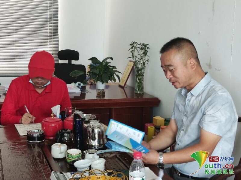 ??圖為企業(yè)負(fù)責(zé)人瀏覽宣傳手冊(cè),并向我們分享日常生活中的節(jié)水竅門(mén),團(tuán)隊(duì)成員認(rèn)真記錄采訪問(wèn)題。中國(guó)青年網(wǎng)通訊員 高亞梅 供圖
