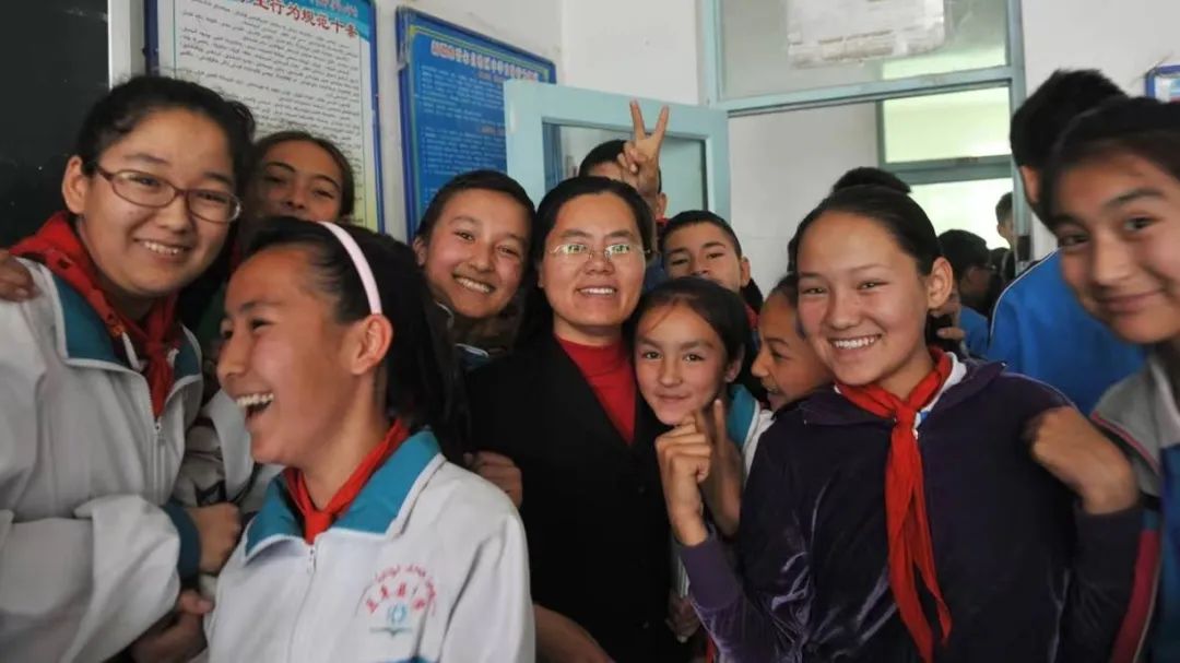 保定學(xué)院2019屆畢業(yè)生劉慶霞在且末縣第二中學(xué)任教,課間與學(xué)生合影