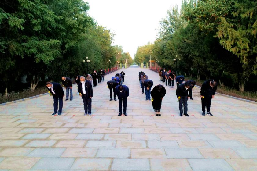 英雄不朽,精神永存。胡楊蒼翠、翠柏頷首。王震將軍銅像,巍然屹立在紅色文化廣場中央,基座周圍花壇上鑲嵌著白菊、百合、黃菊等鮮花組成的花環(huán),寄托著全體塔大黨員干部和師生員工對革命先輩的無限追思。