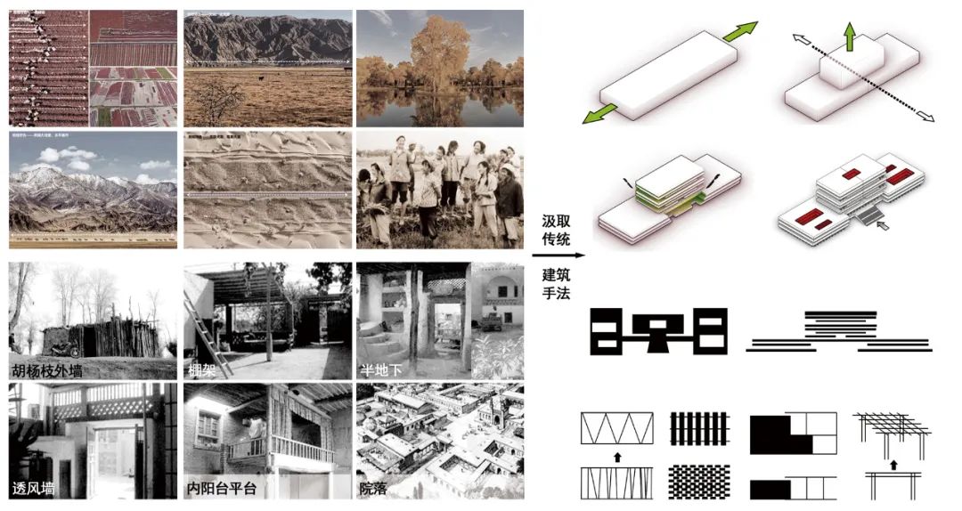 項(xiàng)目團(tuán)隊(duì)在設(shè)計(jì)過程中以“文脈”、“氣候”、“造價(jià)”為基本設(shè)計(jì)條件,學(xué)習(xí)當(dāng)?shù)貍鹘y(tǒng)民居語言并現(xiàn)代轉(zhuǎn)譯,采用質(zhì)樸方正簡潔實(shí)用的建筑布局、被動(dòng)式遮陽采光通風(fēng)與多樣化主動(dòng)調(diào)節(jié)相結(jié)合的設(shè)計(jì)方法,尊重當(dāng)?shù)亓?xí)慣工法及用材,適應(yīng)南疆氣候特征和當(dāng)?shù)亟ㄔO(shè)水平,設(shè)計(jì)適應(yīng)低建設(shè)造價(jià)與低成本運(yùn)營,通過大量計(jì)算機(jī)模擬調(diào)整設(shè)計(jì),達(dá)到舒適、能源與環(huán)境的平衡。01風(fēng)土環(huán)境簡潔、方正、樸素、水平、尺度、傳統(tǒng)轉(zhuǎn)譯