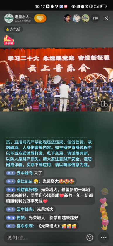 據(jù)塔里木大學(xué)相關(guān)負(fù)責(zé)人介紹,自2022年8月份開始,該校軍樂團(tuán)利用假期進(jìn)行集訓(xùn),之后每周不間斷進(jìn)行訓(xùn)練。截止到音樂會結(jié)束,共有1.7萬師生和家長在線收看演出,累計點(diǎn)贊105萬次。