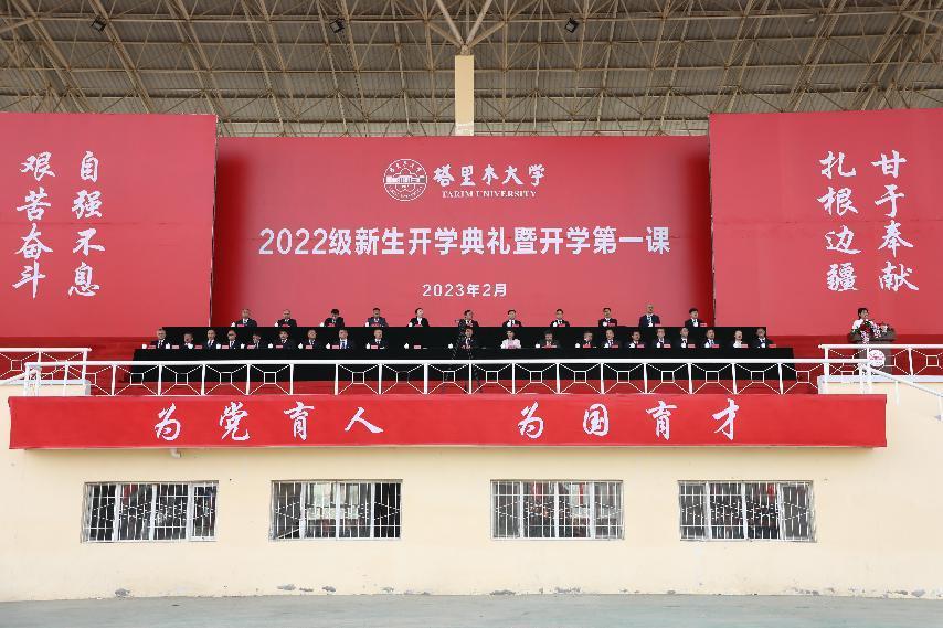 典禮上,塔里木大學黨委書記趙光輝為全體新生講授開學第一課,帶領他們一起回顧了塔里木大學不平凡的建校歷史,為他們列舉了塔里木大學對新疆工作總目標所做的不平凡貢獻,向他們講述了塔里木大學所肩負的重大責任和光榮使命。教導廣大師生要正確認識中國三年抗疫貢獻,要正確理解中國式現代化理論內涵,要正確把握時代發展大勢,要正確體悟胡楊精神真諦,自覺傳承和弘揚胡楊精神,不負時代、不負韶華,在為實現人民美好生活向往的不懈奮斗中用青春書寫華彩篇章,為社會主義現代化建設添磚加瓦,為實現中華民族偉大復興貢獻力量。