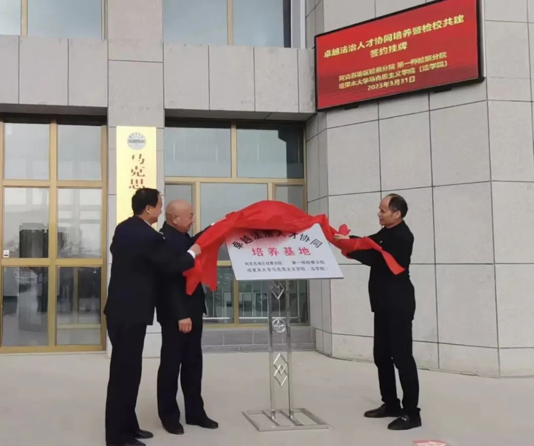 為全面貫徹黨的二十大精神,深入踐行習近平法治思想和新時代黨的治疆方略,加強兵地檢察機關協作配合,實現檢察機關與高等院校資源共享與優勢互補,推動法學理論研究與檢察實務融合共進,促進高層次法律人才培養,推進新時代檢察工作高質量發展,共同推動地區社會穩定和長治久安,3月31日,阿克蘇地區檢察分院、第一師檢察分院與塔里木大學馬克思主義學院(法學院)三方舉行卓越法治人才協同培養暨檢校共建合作協議簽約揭牌儀式,簽署戰略合作框架協議書,三方主要領導就進一步深化檢校合作、加強理論研究與檢察實務深度融合進行座談交流。塔里木大學馬克思主義學院(法學院)黨委副書記、院長秦澤洪,阿克蘇地區檢察分院黨組成員、政治部主任劉文勇,第一師檢察分院黨組成員、副檢察長朱平參加簽約揭牌儀式。