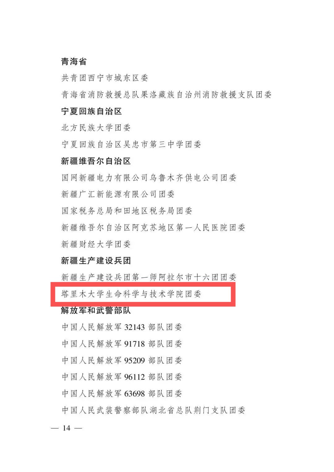 其中,第一師阿拉爾市十六團(tuán)團(tuán)委、塔里木大學(xué)生命科學(xué)與技術(shù)學(xué)院團(tuán)委榮獲全國五四紅旗團(tuán)委;國家稅務(wù)總局五家渠稅務(wù)局團(tuán)支部、第九師161團(tuán)孫龍珍民兵班團(tuán)支部榮獲全國五四紅旗團(tuán)支部;第五師雙河市雙樂鐵路護(hù)路民兵分隊(duì)隊(duì)員軒銀龍、第七師中醫(yī)院醫(yī)生宮傲榮獲全國優(yōu)秀共青團(tuán)員;第八師石河子市消防救援支隊(duì)南子午路消防救援站團(tuán)支部書記丁亞麗、石河子大學(xué)醫(yī)學(xué)院團(tuán)委書記滕婉蓉榮獲全國優(yōu)秀共青團(tuán)干部。