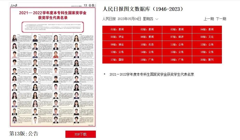 5月4日出版的人民日報,刊登了100名研究生國家獎學金獲獎學生優(yōu)秀代表、100名本專科生國家獎學金獲獎學生優(yōu)秀代表和100名中等職業(yè)教育國家獎學金獲獎學生優(yōu)秀代表名錄。