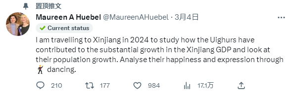 然而,對中國有一定了解的休伯爾對所謂“新疆存在種族滅絕”等說法表示質疑,她為此專門開設推特賬號,了解、研究、分享有關新疆的真實情況。