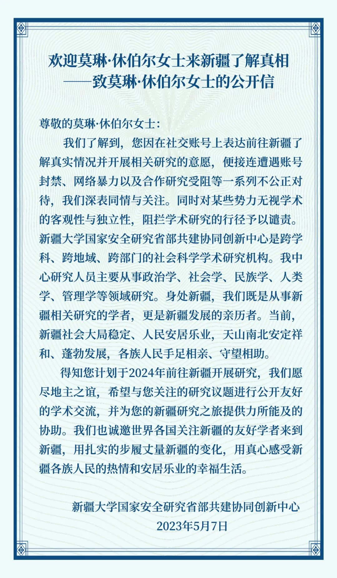 同時,西南政法大學人權研究院、西北政法大學國家安全學院、蘭州大學中亞研究所、新疆大學國家安全研究協同創新中心、新疆師范大學民族與社會高等研究院、塔里木大學、伊犁師范大學“一帶一路”發展研究院、石河子大學區域國別研究中心、喀什大學南疆經濟與社會發展研究中心也紛紛發布消息,表示“歡迎莫琳·休伯爾女士來新疆”。