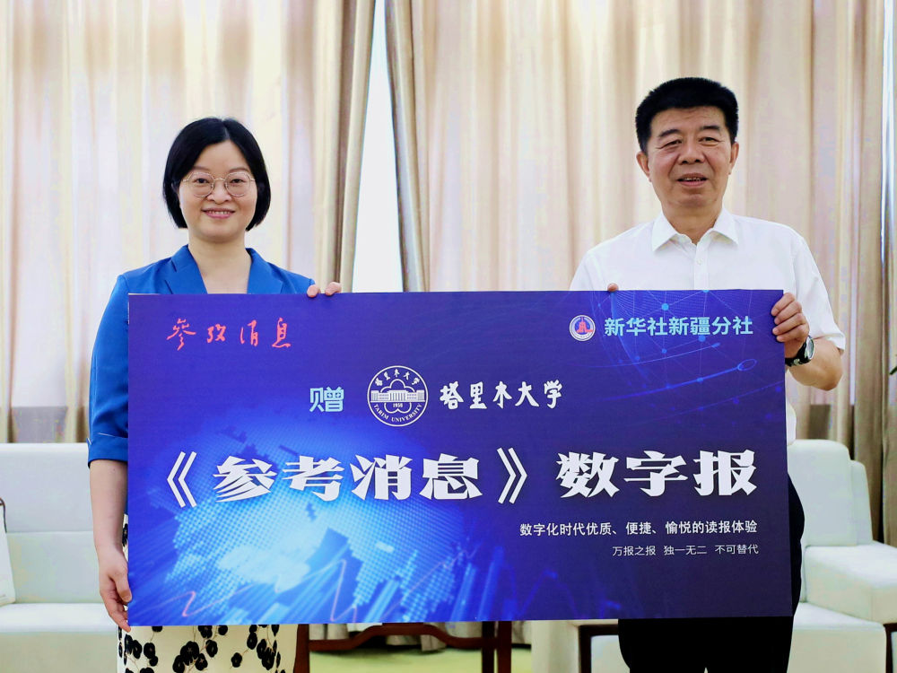 塔里木大學黨委書記趙光輝(圖右)代表學校接受新華社贈閱《參考消息》數字報
