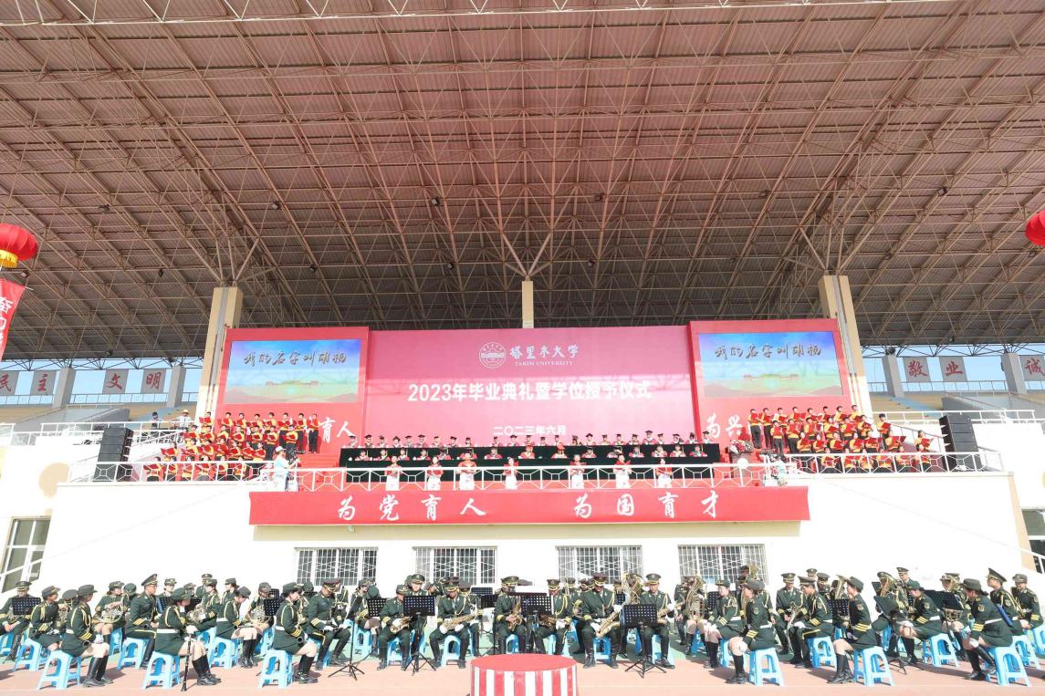 上午9時,伴隨著莊嚴的升國旗儀式、嘹亮的奏唱國歌聲和軍樂團演奏聲,塔里木大學2023年畢業典禮暨學位授予儀式在西區運動場拉開帷幕。