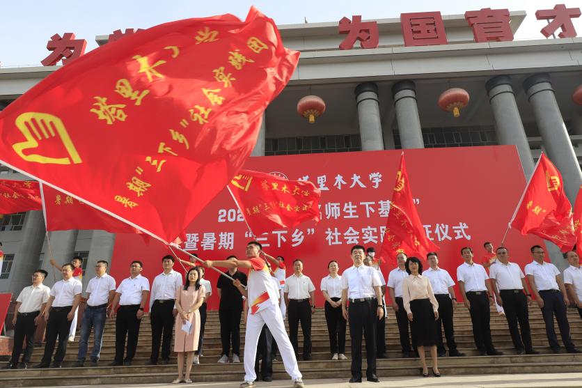 塔里木大學(xué)黨委書(shū)記趙光輝為出征團(tuán)隊(duì)授旗并宣布2023年塔里木大學(xué)‘萬(wàn)名師生下基層’暨暑期‘三下鄉(xiāng)’社會(huì)實(shí)踐現(xiàn)在出征。
