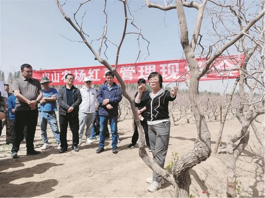 塔里木大學果樹學教師團隊在十四師皮山農場對職工群眾進行紅棗凍害補救管理技術培訓(資料圖片)。林敏娟攝