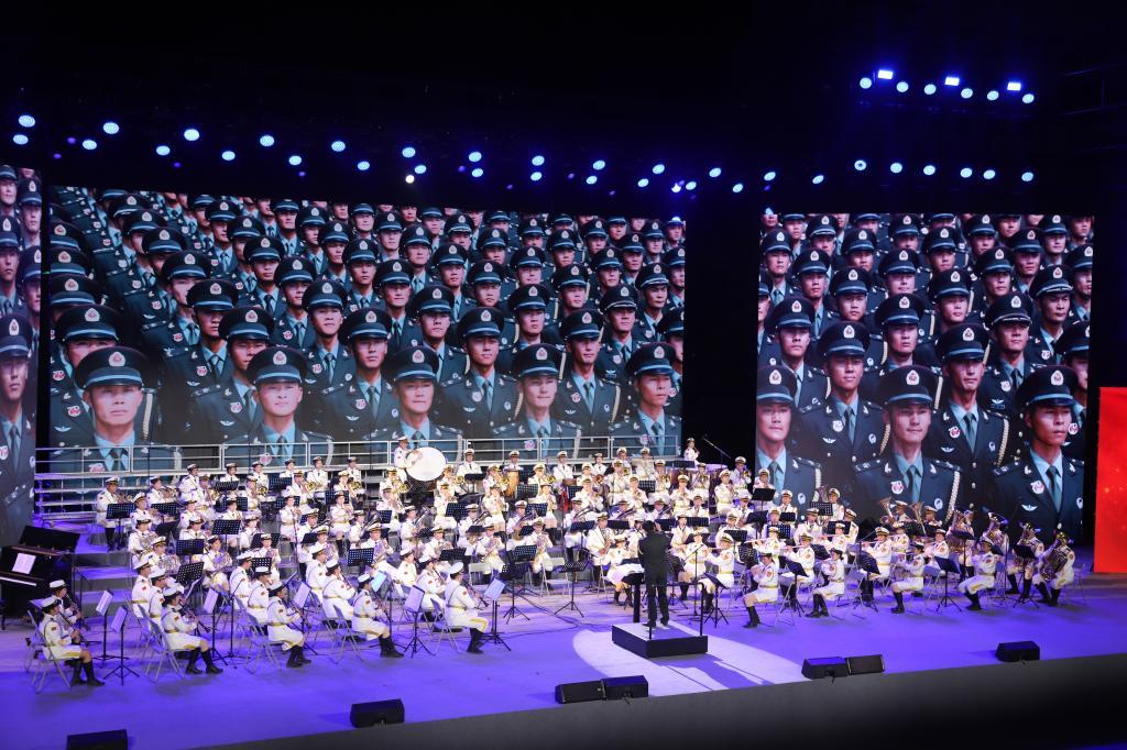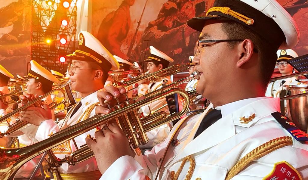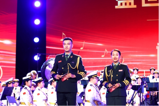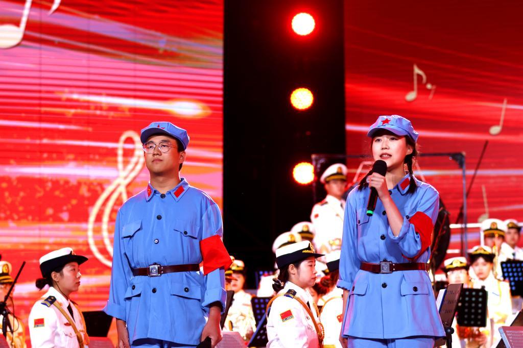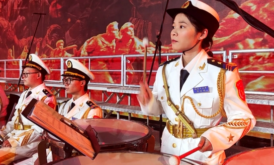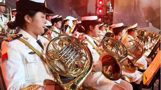 “路迢迢,秋風涼。敵重重,軍情忙。紅軍夜渡于都河,跨過五嶺搶湘江……” 伴隨著聲情并茂的詩朗誦《突破封鎖線》,音樂會正式拉開序幕,華麗的制服,金色的鼓號,高亢激昂的音樂充滿演奏現場。