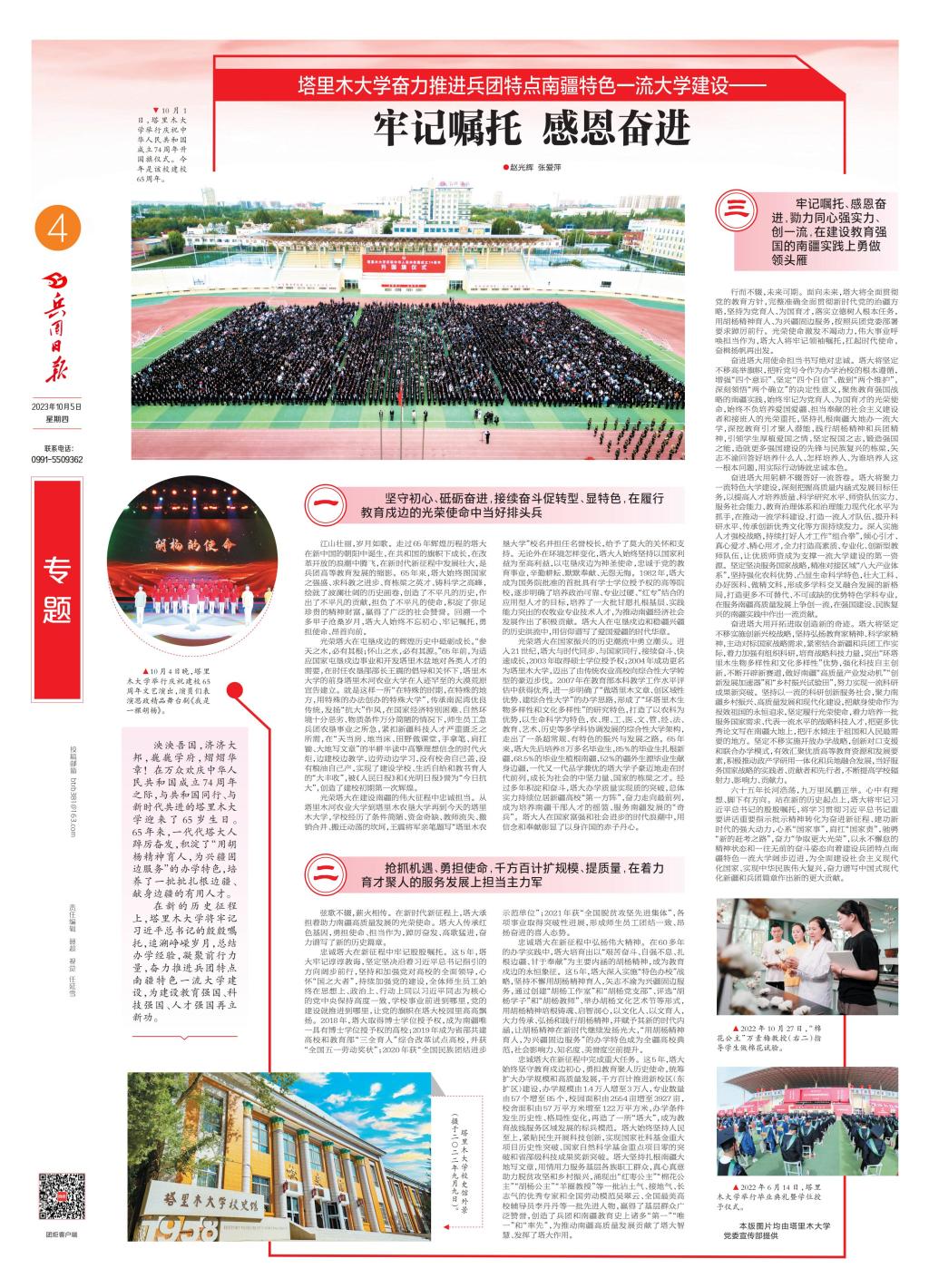 六十五年長河浩蕩,九萬里風鵬正舉。心中有理想、腳下有方向。站在新的歷史起點上,塔大將牢記習近平總書記的殷殷囑托,將學習貫徹習近平總書記重要講話重要指示批示精神轉化為奮進新征程、建功新時代的強大動力,心系“國家事”,肩扛“國家責”,馳騁“新的趕考之路”,奮力“爭取更大光榮”,以永不懈怠的精神狀態(tài)和一往無前的奮斗姿態(tài)向著建設兵團特點南疆特色一流大學闊步邁進,為全面建設社會主義現(xiàn)代化國家、實現(xiàn)中華民族偉大復興,奮力譜寫中國式現(xiàn)代化新疆和兵團篇章作出新的更大貢獻。