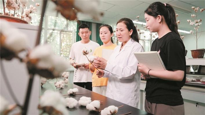 2022年10月27日,“棉花公主”萬素梅教授(右二)指導(dǎo)學(xué)生做棉花試驗。