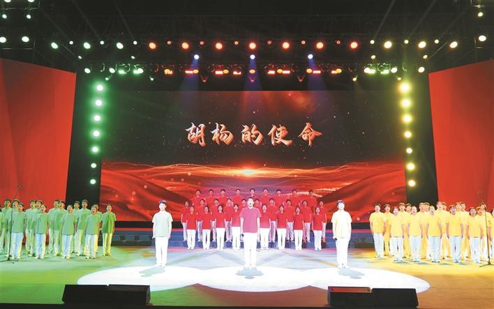 10月4日晚,塔里木大學(xué)舉行慶祝建校65周年文藝演出,演員們表演思政精品舞臺劇《我是一棵胡楊》。