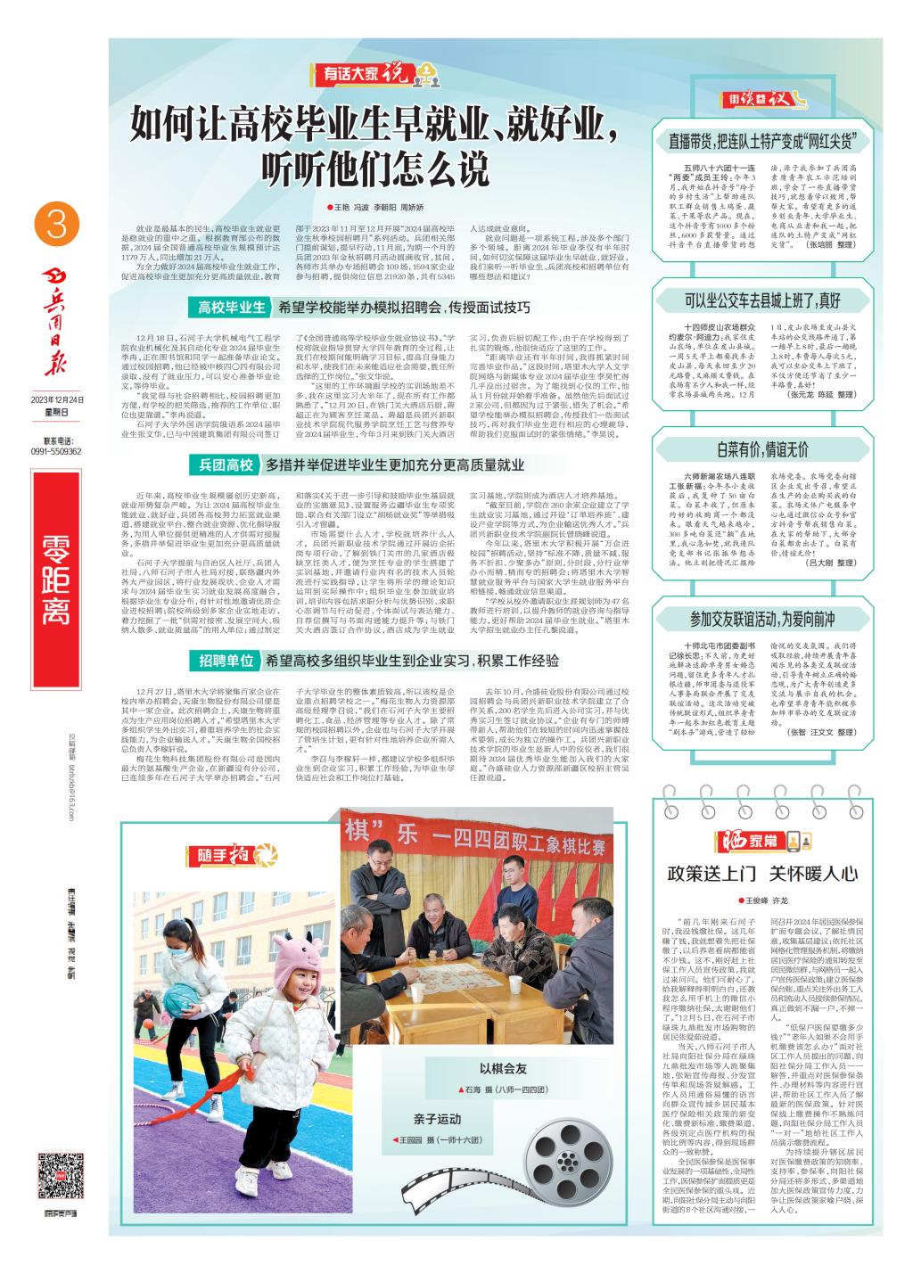 就業問題是一項系統工程,涉及多個部門多個領域。距離2024年畢業季僅有半年時間,如何切實保障這屆畢業生早就業、就好業,我們來聽一聽畢業生、兵團高校和招聘單位有哪些想法和建議?