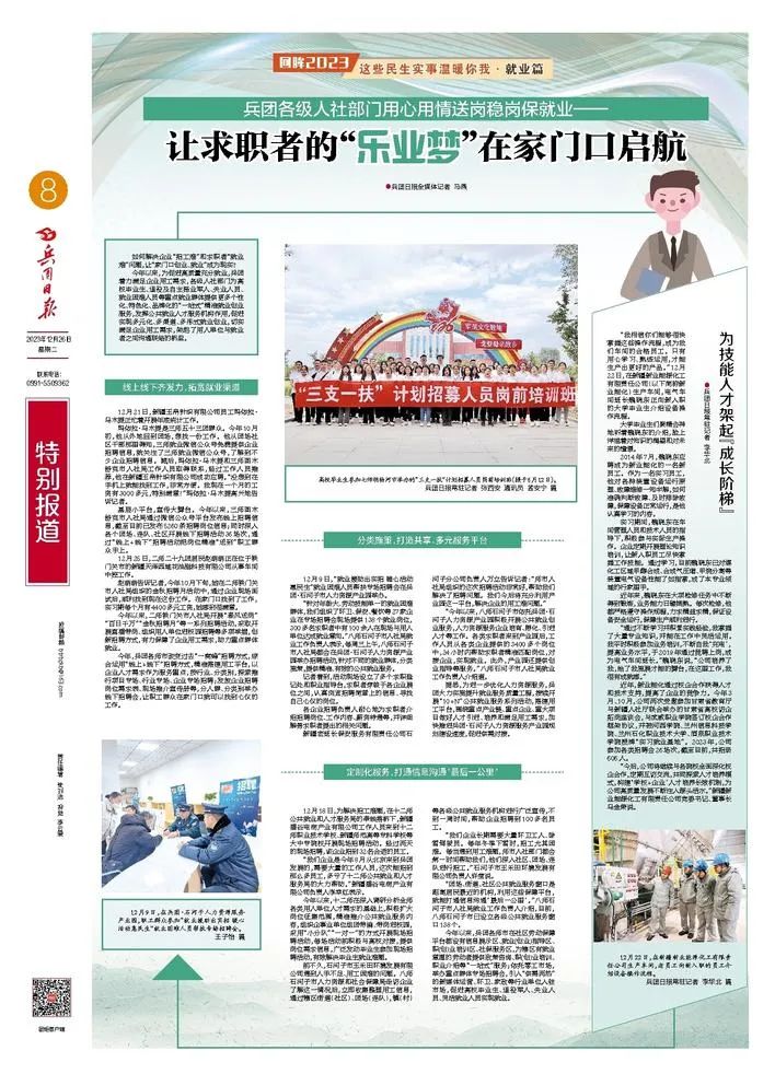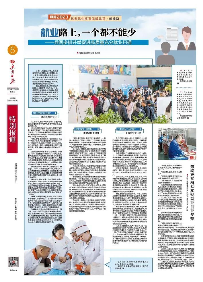 實現(xiàn)高質(zhì)量充分就業(yè),離不開完善的就業(yè)服務(wù)。送信息、送服務(wù),是促進就業(yè)的必要之舉、有力之舉。今年以來,兵團成立由教育局、人社局、國資委、團委等25個部門和單位組成的2023屆兵團高校畢業(yè)生就業(yè)工作專班,多次赴石河子大學(xué)、塔里木大學(xué)、新疆政法學(xué)院等高校,對畢業(yè)生就業(yè)工作進行督查和指導(dǎo);下大力氣開展技能培訓(xùn)、做好重點群體幫扶,充分發(fā)揮職業(yè)技術(shù)教育、技能技工教育等平臺陣地作用,廣泛開展訂單式培養(yǎng)和校企聯(lián)合培養(yǎng),大規(guī)模培養(yǎng)技能型人才……把就業(yè)指導(dǎo)服務(wù)做細做實,對就業(yè)困難群體的幫扶精心、暖心,一年來,兵團通過著力織好就業(yè)“服務(wù)網(wǎng)”,為勞動者能就業(yè)、好就業(yè)打下堅實基礎(chǔ)。