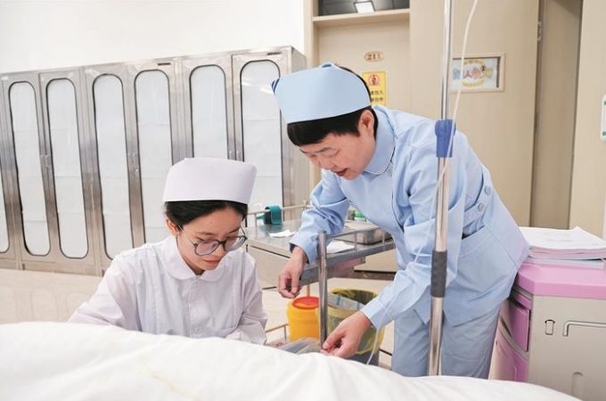 12月18日,兵團興新職業(yè)技術(shù)學(xué)院護理專業(yè)學(xué)生(左)在學(xué)習(xí)護理知識。 李嘉成 攝