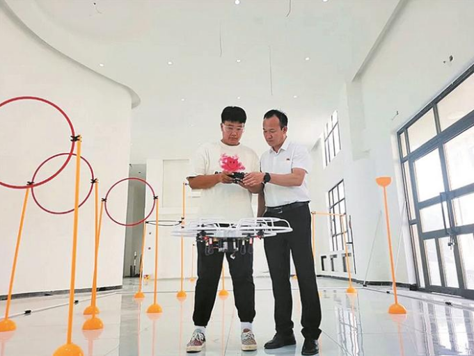 四師可克達拉職業(yè)技術(shù)學(xué)校教師(右)輔導(dǎo)學(xué)生操作無人機(攝于6月24日)。 侯雨彤 攝