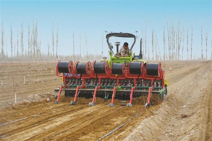 3月17日,十四師二二五團三連西梅地里,播種機在作業。近期,二二五團農業發展服務中心做好農機檢修、維護工作;對接合作社和農資店,確保種子、肥料、農藥、農膜等農資供應;組建農業技術服務隊伍,深入田間地頭,為職工群眾解決農業生產中遇到的問題,助力春耕春播。陳陽陽 攝