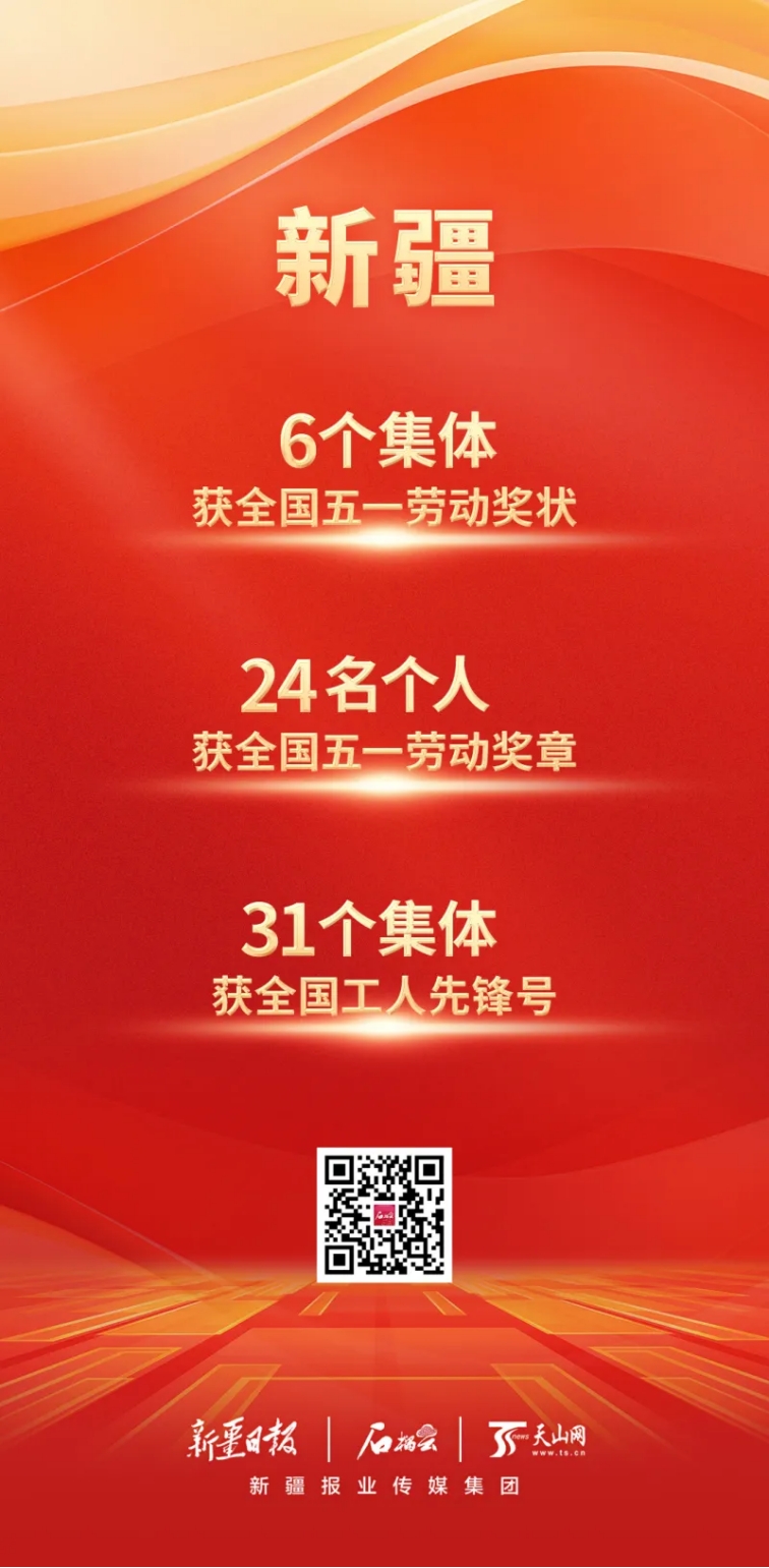 4月28日,2024年慶?!拔逡弧眹H勞動節暨全國五一勞動獎和全國工人先鋒號表彰大會在北京人民大會堂舉行,255個集體和1088名個人分獲全國五一勞動獎狀、獎章,1034個集體獲全國工人先鋒號。新疆6個集體獲全國五一勞動獎狀,24名個人獲全國五一勞動獎章,31個集體獲全國工人先鋒號。
