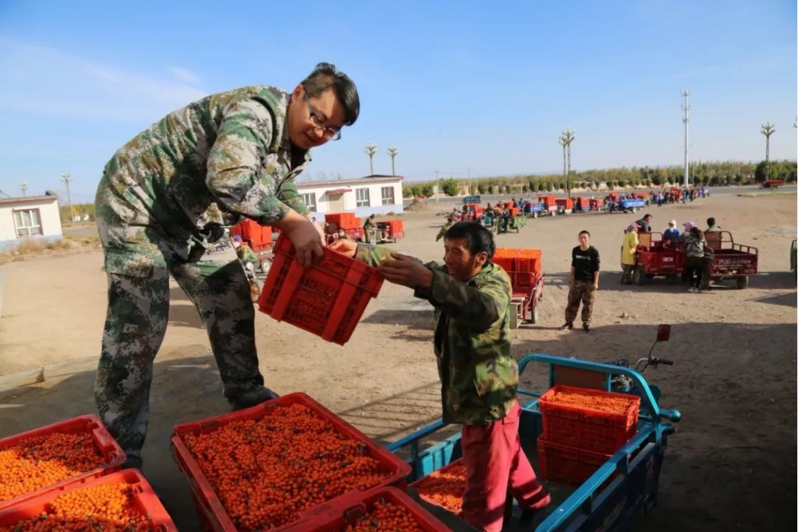 比選擇品種更難的是銷路,為了打開銷路,王軍揚的足跡更是遍布全國各地,然而卻被不斷潑冷水,但他并沒有放棄,而是堅定信念,最終在2019年全國沙棘研討會上,成功與國內沙棘產業領軍企業對接,打開了銷路,170團沙棘的優質品質開始口口相傳,形成了供不應求的銷售場面。從種植技術的攻克到銷路的探尋,十余年,一個個艱苦畫面仿佛就在眼前,卻又已經被風吹散。
