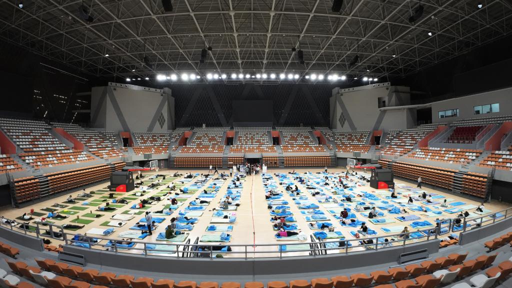 9月6日夜,塔里木大學體育館內,數百名家長準備在此就寢。新生入學之際,該校在學校大型館所安置500張床位,提供給陪同新生報到的家長們。(兵團日報全媒體記者 王志清)