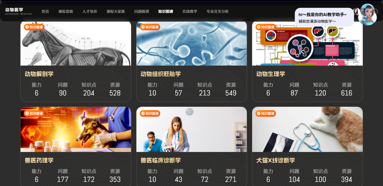 據悉,動物醫學專業圖譜由我校和智慧樹網共同建設,有效實現了AI技術與教育教學深度融合,為培養復合型獸醫人才提供堅實支撐。該圖譜以人才培養為目標,以畢業要求為指引,以六維結構為模型,將圖譜分為七大部分,有效實現專業知識點、典型問題、思政點、實踐點有機融合,推動動物醫學專業資源建設集中化、結構化、數字化和可視化,為學生提供了全新學習路徑。